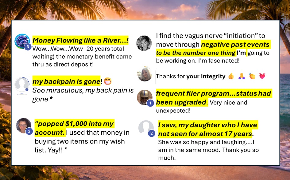 "Wow! I love your work it is amazing! You went right to the targeted core with the big guns!. Had lots of energy moved out. something I've been working on for years profoundly lifted. I feel so grateful. Thank you Thank you Thank you Bonnie thank you Darius"